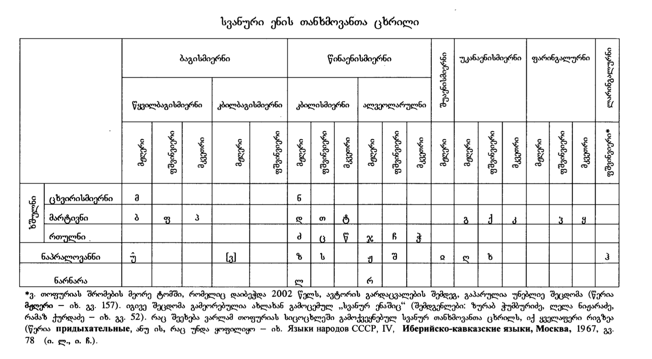 სვანურში არტიკულაცია უკანაა და უფრო დახურული, ამიტომაა, რომ კარგად არის შენახული ფარინგალები ჴ, ყ. მეექვსე სამეული დეფექტურია: აკლია მჟღერი ფარინგალი. ვარაუდობენ, რომ იგი შემორჩენილია ზოგიერთი სვანის ამა თუ იმ სიტყვის წარმოთქმაში, მაგრამ მოქმედი ბგერა არ არის და ფონოლოგიური ფუნქცია არა აქვს. უკანა არტიკულაციით აიხსნება აგრეთვე უ̂-ს წინ ღ და გ-ს განვითარება, გ, კ თანხმოვნიანი კომპლექსების წარმოქმნა.